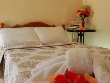 One queen bed with private bath (with shower heater)and Cabled Television & Breakfast for 2. (Extra Mattress is Not Applicable)